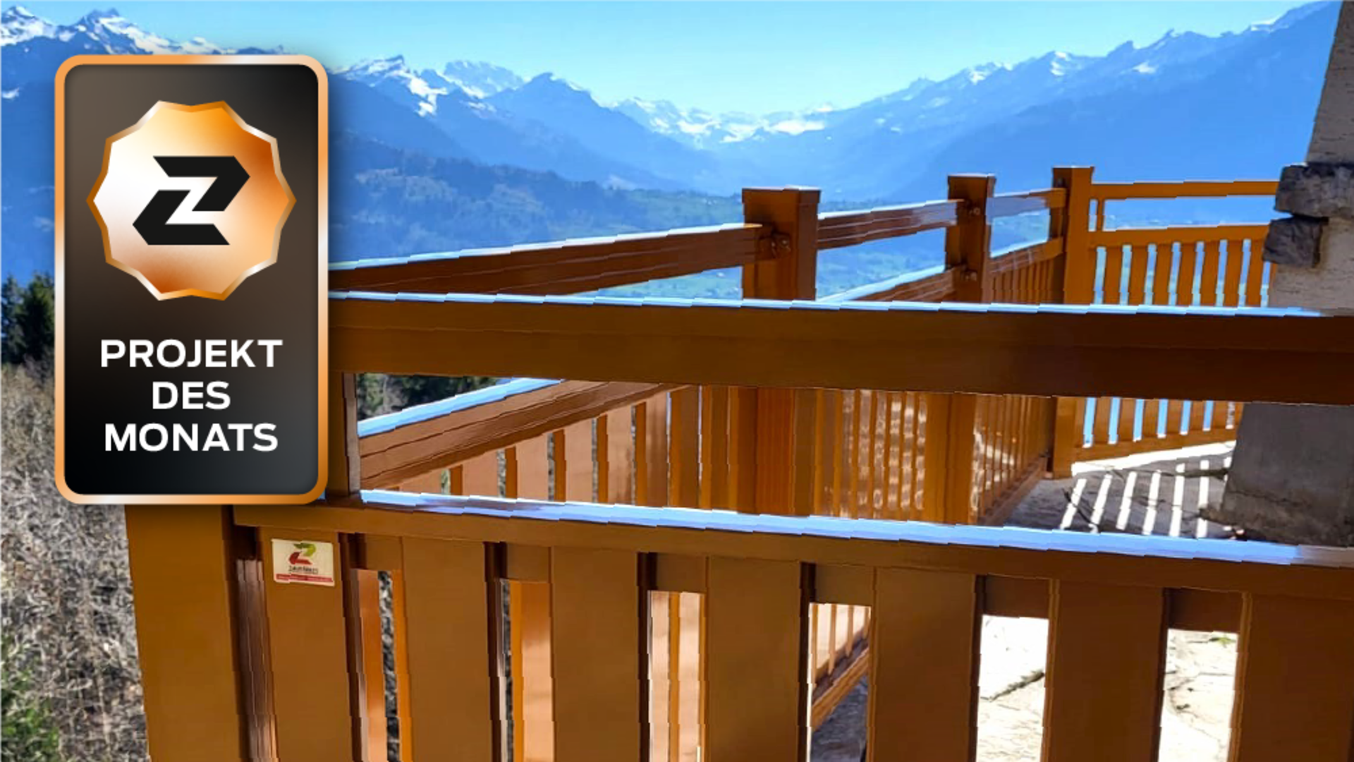 Zaunteam Berner Oberland hat das Projekt des Monats Mai 2025 mit einem Geländer gewonnen. Das moderne Geländer dient als Absturzsicherung und fügt sich optisch passend an das bestehende Holzhaus an.