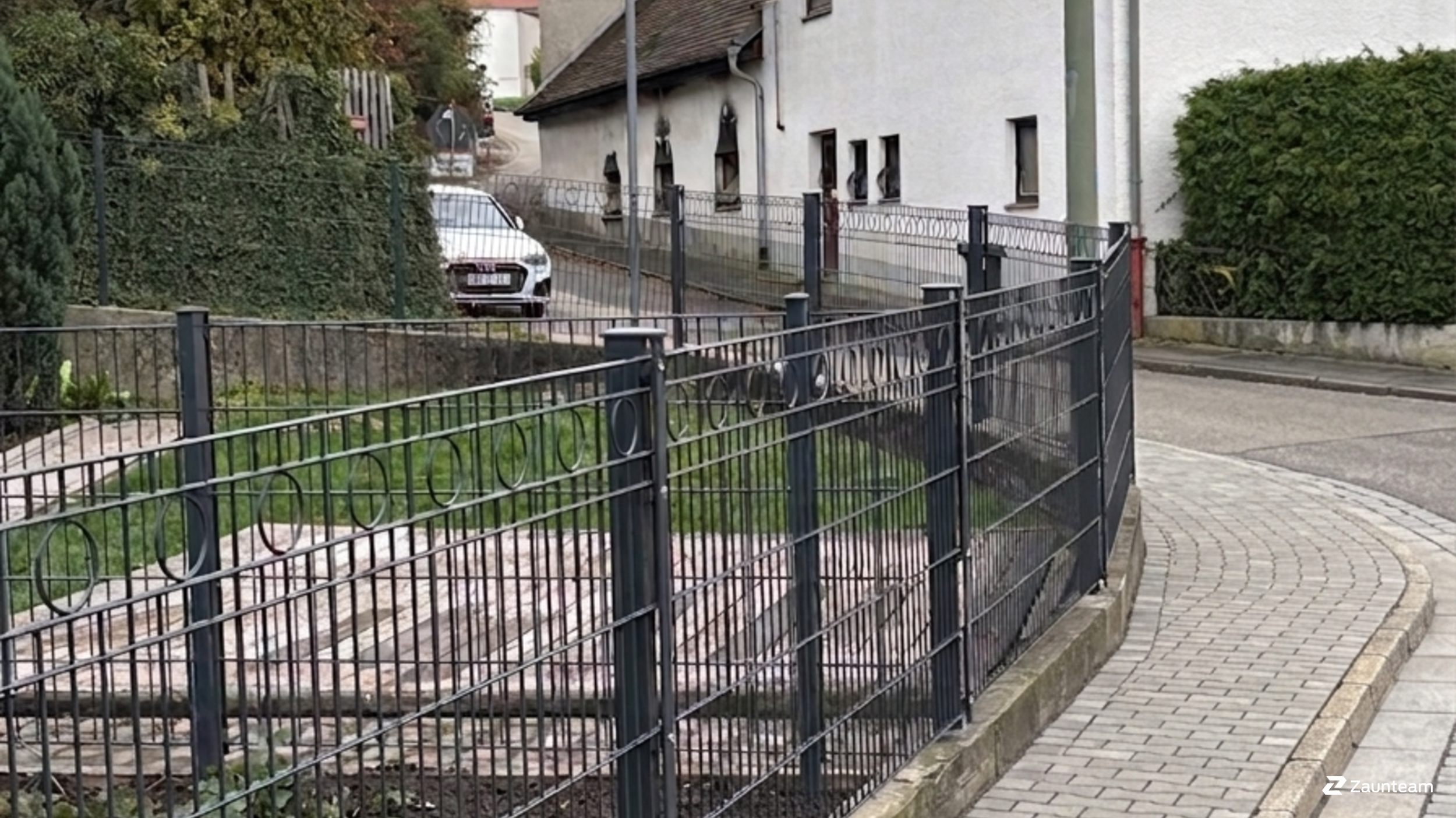 Ein moderner Design-Zaun aus Metall mit kreisförmigen Schmuckelementen. Der Deko- Doppelstabmattenzaun Berlin ist ein besonders robustes und universelles System, das auf dem bewährten Doppelstabmattensystem basiert.