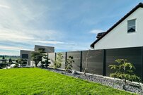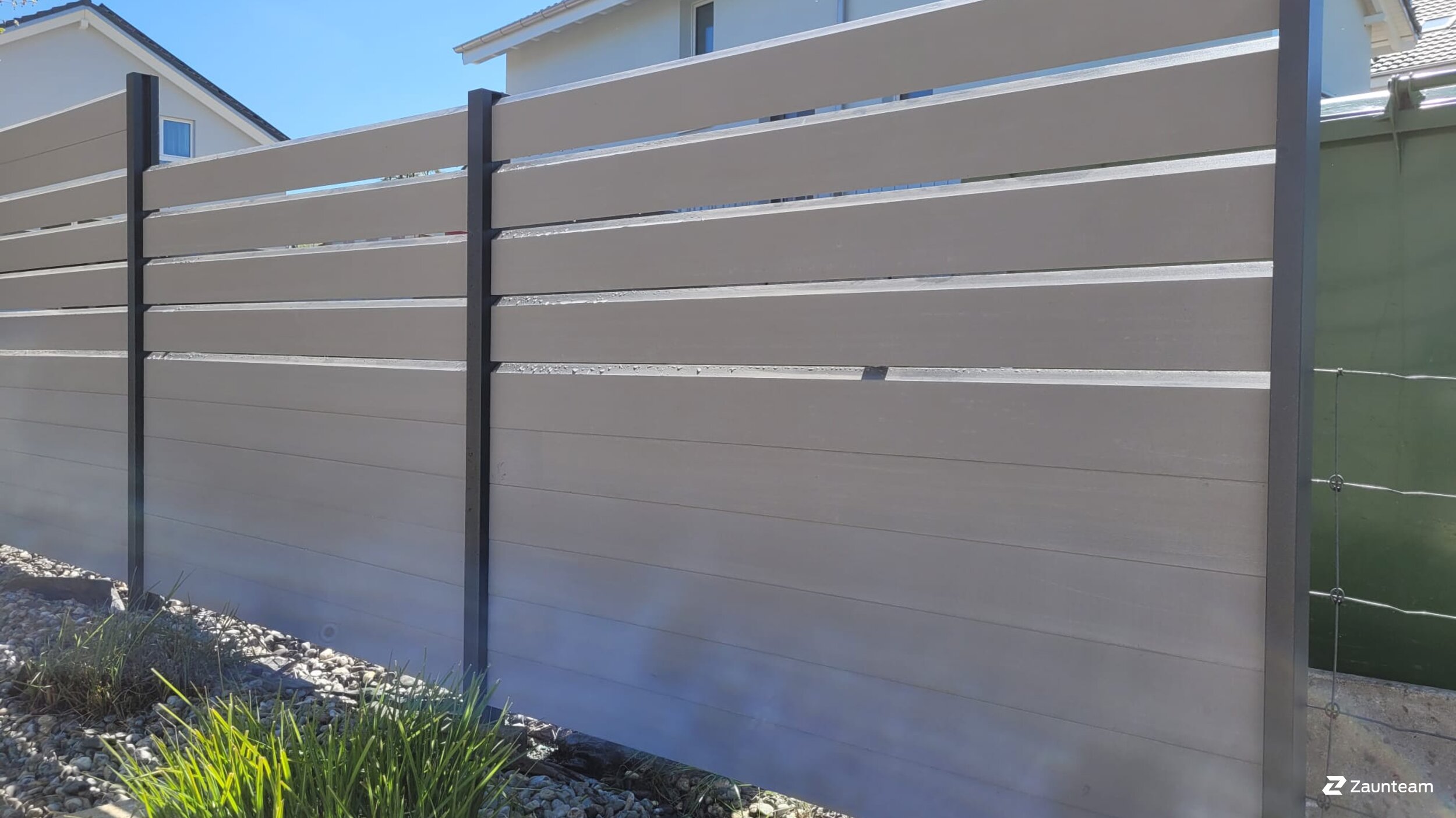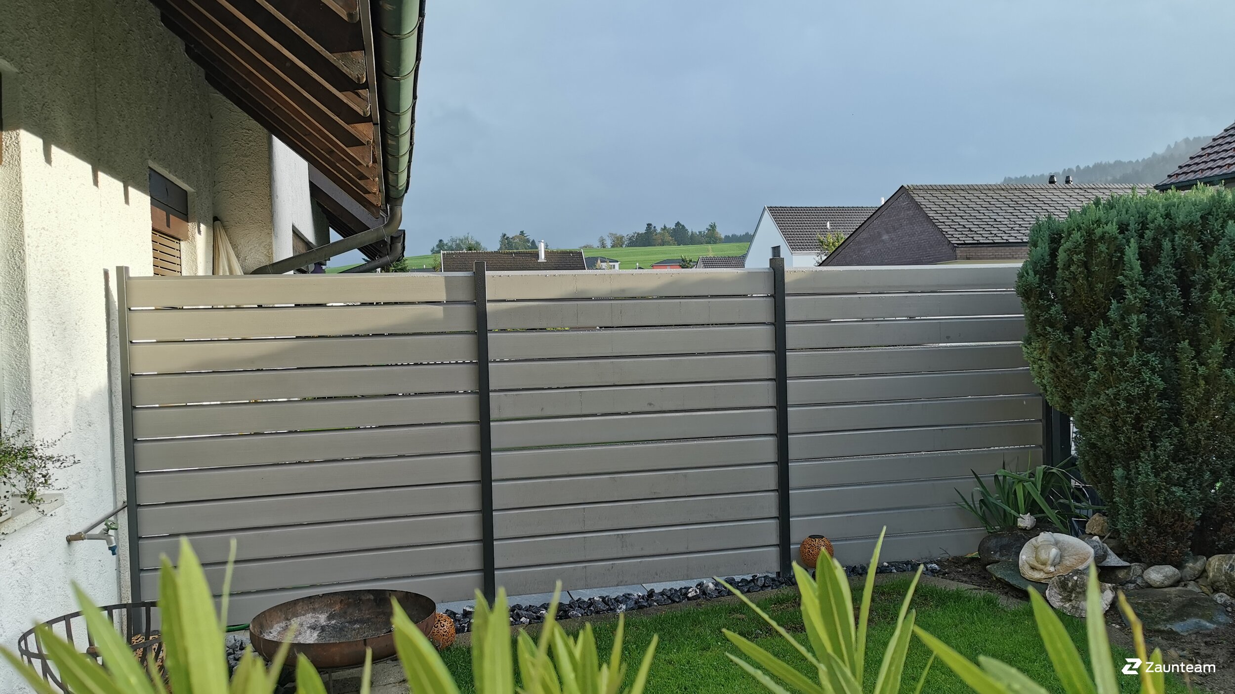 Die modulare Bauweise dieser Sichtschutzmodelle mit den ästhetisch wirkenden Glas- und Alu Einsätzen bietet eine Vielzahl an Gestaltungmöglichkeiten.